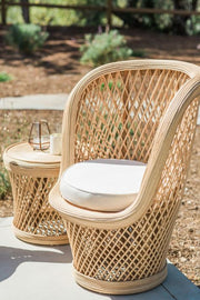 Outdoor-ready cane chair with cushion, light and stylish for patios and gardens.